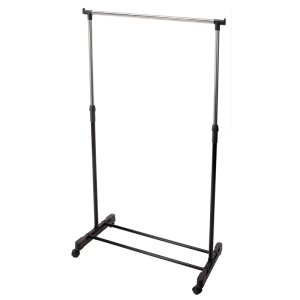 stojan na oděvy jednoduchý, 4 kolečka. 1 jednoduchá závěsná tyč, rám z nerezové oceli, černé vnější a černé tyče. tyče z nerezové oceli na horní straně: 19 mm. spodní tyče 16 mm. tloušťka 0,25 mm, pp …