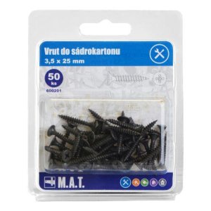 rozměry (pr. x D): 3,5 x 25 mm jemný závit fosfát 50 ks Vruty do sádrokartonu, pro připevnění sádrokartonové desky k profilu či konstrukci.