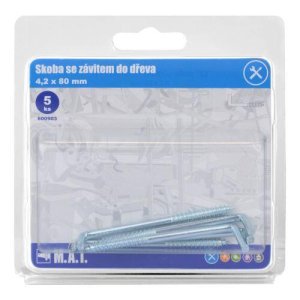 rozměry (D x pr.): 80 x 4,2 mm materiál: Zn 5 ks Skoba se závitem do dřeva 80 x 4,2 mm slouží pro snadné zašroubování do dřeva a následné zavěšení předmětů a břemen.