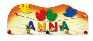Dřevěný věšák jako dekorace do každého dětského pokojíčku, ve veselých barvách s obrázky práčků na šňůrce, s barevným nápisem s medvídky, 5 úchytů, rozměry: 60x5x24 cm