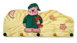 Věšák s pěti háčky, medvídek v pyžamu na přírodní dřevěné desce, rozměry: 60x5x29,5 cm