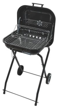 Obdélníkový gril, grilovací plocha 43 x 40 cm, odkládací rošt, odolná smaltovaná ocel, 4 kovové nohy, 2 plastová kolečka, madla z plastu, regulace proudění vzduchu.