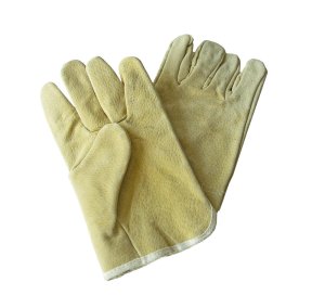 Ochranné pracovní rukavice z hovězí štípenky, hřbet z hrubé bavlněné tkaniny, tuhá manžeta, podšívka v dlani.