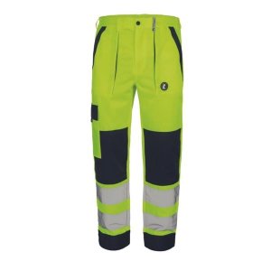 Pánské HI-VIS pracovní kalhoty s elastickým pasem 2 přední kapsy, 1 stehenní kapsa, 2 zadní kapsy se zapínáním na suchý zip 2 šité 7,5 cm široké reflexní pruhy na spodních částech nohavic Zesílená oblast …