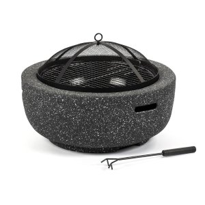 Přenosné ohniště na dřevo, vnitřní část z kvalitní oceli s vysokoteplotním nátěrem, robustní tělo z páleného kamene z oxidu hořečnatého, poklop s pletivem, pohrabáč na uhlíky, šedé.