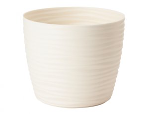Plastový, matný, hladký květník s linií pod horním okrajem.
