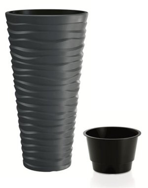 Vysoký květináč, objem 54 l, design s texturou vlnek, vhodný do exteriéru i interiéru, v balení praktická vložka pro sázení rostlin, rozměry 39 x 75 x 39 cm, antracitová barva.