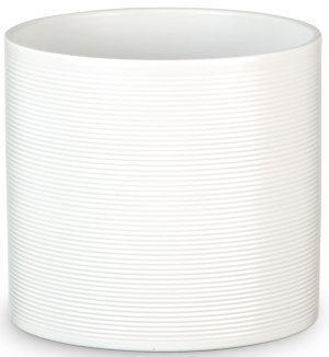 Keramický obal na květník s nápadnou strukturou vodorovných drážek, které rotují po obvodu.