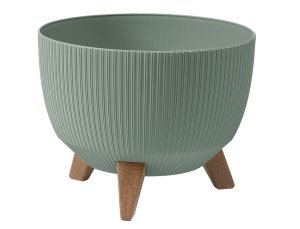 Matná plastová žardinka s poutavým vzhledem na třech nožičkách v dekoru dřeva.