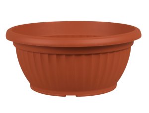 Polypropylenová, vysoce odolná matná žardinka v barvě terakoty o průměru 40 cm a výšce 17 cm. Žardinka je pruhovaná.