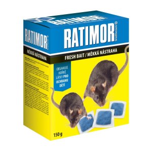 Jed RATIMOR BRODIFACOUM měkká nástraha, 150 g. balení: 150 g Rodenticid ve formě měkké návnady s aktivní látkou brodifacoum určený k hubení myší domácích a potkanů.