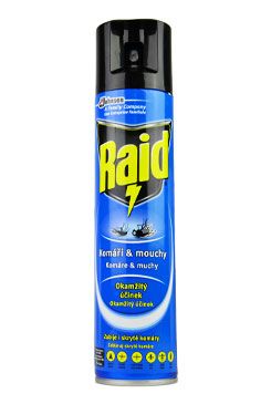 Raid proti komárům a mouchám je insekticidní aerosolový přípravek na vodní bázi se svěží vůní k okamžitému hubení létajícího hmyzu, jako jsou komáři, mouchy, jejich vajíčka, ale i vosy a další.