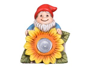 Solární lampa v podobě trpaslíka se slunečnicí.