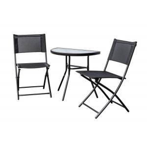 Set zahradní / balkonový MARCO, stůl + 2 židle. set obsahuje: 1 x půlkruhový stůl s prosklenou vrchní deskou, rozměry 70 x 40 x 63 cm 2 x skládací židle, s textilenovým výpletem 2 x 1, rozměry 55 x 45,5 …