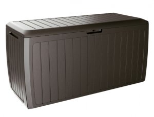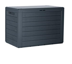 Zahradní box Keter s objemem 270 l, kolečka a nízká hmotnost boxu pro snadné přemisťování, vzhled hodící se téměř do každé zahrady či domova, odolný vůči UV záření, barva grafitová.