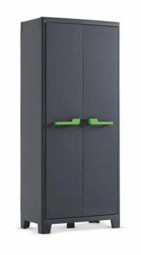 Vysoká plastová skříň, uzamykatelná, nastavitelné police s možností sklopení, nosnost 15 kg, IPX3, dřevěná madla.