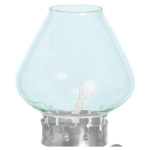 Stojací petrolejová lampa se zrcadlem a skleněným tělem.