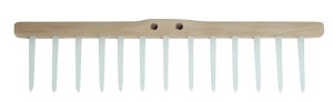 Silné kovové hrábě s 14 hroty a dřevěnou násadou.