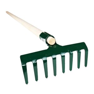 Kovové hrábě s 10 hroty s dřevěnou násadou.