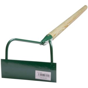 Zahradní motyka / okopávačka s dřevěnou násadou. Šířka 95 mm, výška okopu plochy 70 mm, délka celkem 360 mm.