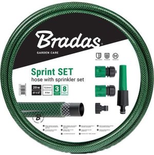 příslušenství: klasická nastavitelná tryska, rychlospojka stop a standardní, adaptér na kohoutek Vyztužená zahradní hadice SPRINT 1/2" z měkčeného PVC, která se skládá ze 3 vrstev s příslušenstvím.
