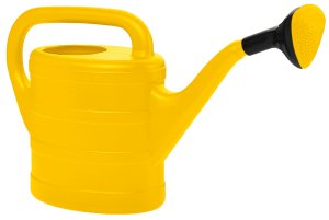 Plastová zahradní konev s kropítkem.