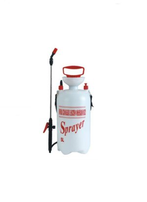 Tlakový ramenní postřikovač v bílé barvě o objemu 5 litrů určený k zahradním postřikům.