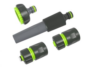 Sada zahradních armatur, jež obsahuje adaptér na kohoutek (NG č. 17521), proudnici (NG č. 17771), rychlospojka (NG č. 17801), stoprychlospojka (NG č. 17906).