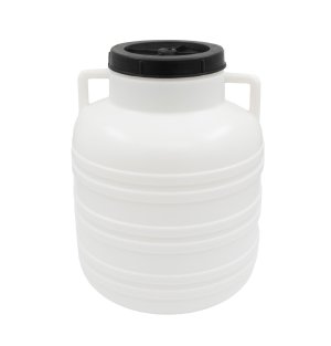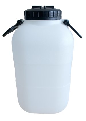 Plastová širokohrdlá konev (sud) se šroubovacím víkem o objemu 30 litrů.