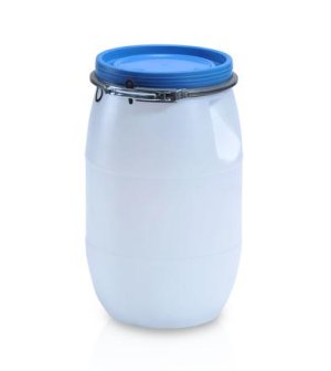 Plastová širokohrdlá konev (sud) se šroubovacím víkem o objemu 60 litrů.