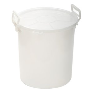 Bílý čirý plastový barel se zaklapávacím víkem a uchy, vhodný na sběr ovoce, zeleniny, na vodu, kvas, zimní uskladnění potravin atd.