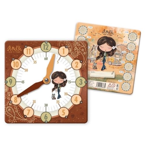 Papírové dětské hodiny na výuku s designem známého děvčátka Anekke z dílny španělské návrhářky. <br> • obsahují ciferník se zvýrazněnými čísly 3, 6, 9 a 12 také čísla od 1 po 12 a minutové dělení s pohyblivými ručičkami <br> • zadní strana hodinek slouží jako učební pomůcka, do které mohou děti zakreslovat čas, který dostanou za úkol
