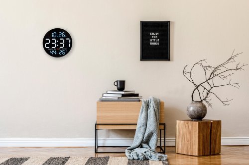 rozměry: 25,2 x 25,2 x 2,8 cm hmotnost: 500 g materiál: akryl, plast barva: černá LED displej číslice: arabské