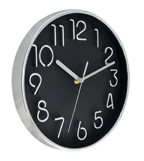 průměr: 30 cm výška: 4,3 cm materiál: plast, kov, sklo barva: stříbrný rám / černý podklad / stříbrná čísla