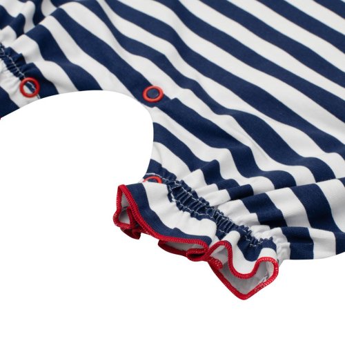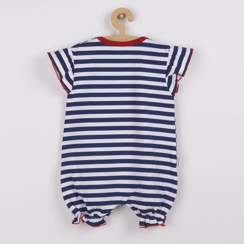 Letní bavlněný overal s krátkým rukávem české značky New Baby Marine. Overálek s krátkým volánkovým rukávem celopotištěný moderními pruhy s nášivkou kotvy. Nášivka je podlepená látkou proti poškrábání. Má praktické zapínání na cvočky na ramínku a mezi nožičkama, což usnadní oblékání a přebalování. Super stylový letní motiv rozzáří každé miminko. Složení: 100% bavlna.