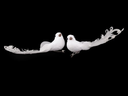Dekorační [holubici] zdobí působivá [kudrnatá] peříčka. Zespodu má připevněnou kovovou sponu, díky které ji můžete připevnit například na věnec, větvičku, záclonu či ji naaranžovat do květinových vazeb. [Hodí se ke svatebnímu i vánočnímu aranžování.] [Holubice] č. 2 má hlavičku ozdobenou glitry.