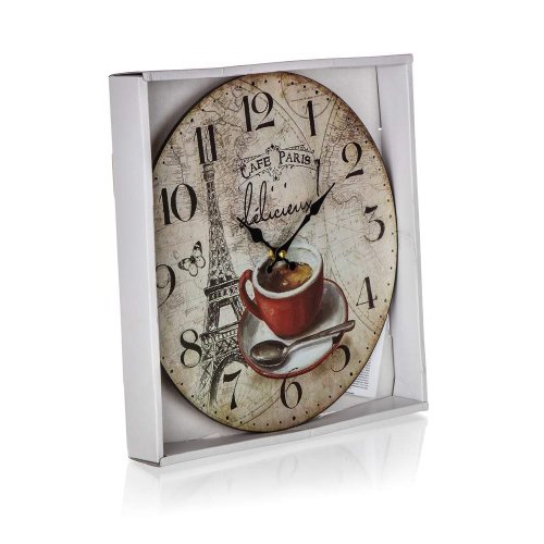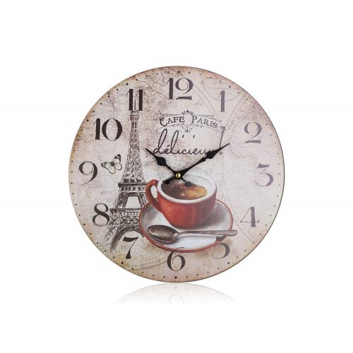 Nástěnné kulaté hodiny CAFE PARIS o průměru 34 cm s celoplošným dekorem jsou skvělý pomocník do domácnosti, ale slouží také jako dekorace interiéru. Hodinový strojek je napájen jedním kusem baterie AA (není součastí balení). V nabídce další dekory.