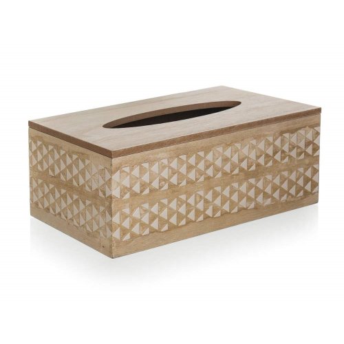 Krabička na papírové kapesníčky 24 x 13 x 9,5 cm je vybavena otvíracím víkem s panty na doplnění. Krabička je v barvě přírodního dřeva ze 3 stran zdobena bílým ornamentem.