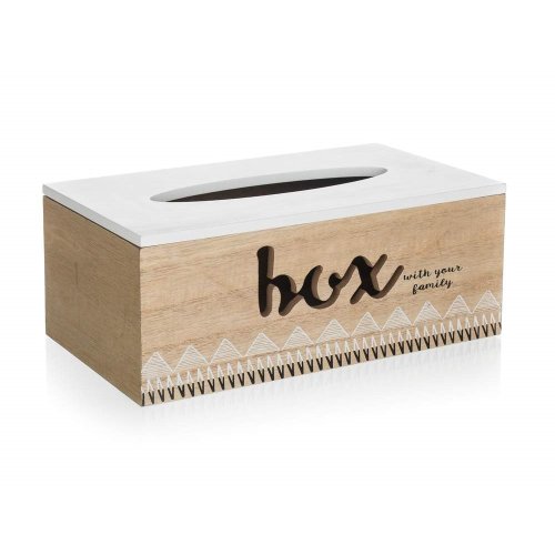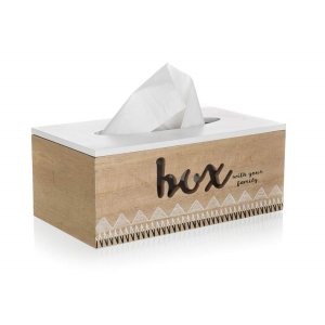 Krabička na papírové kapesníčky FAMILY 24 x 13,5 x 9,5 cm je vybavena otvíracím víkem s panty na doplnění. Horní část je bílá, na čelní straně černý nápis with your family, černo-bílý vzor a vyřízlý otvor BOX.