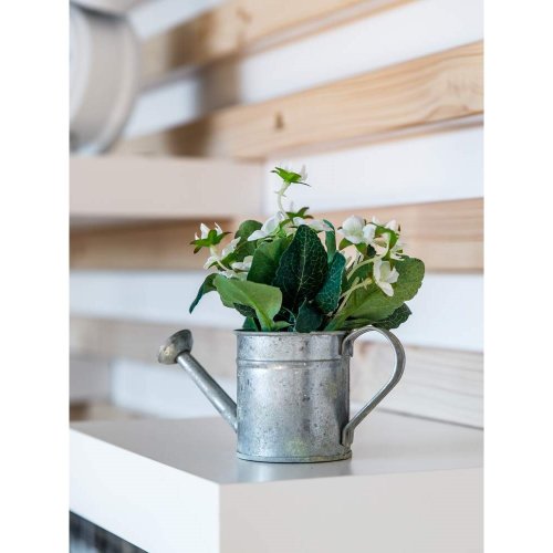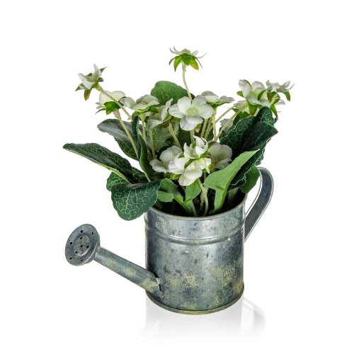 Bíla květina Begonia v plechovém květináči ve tvaru konvičky 17 x 15 cm, je umělá květina, která slouží jako náhrada živých rostlin a skvěle se hodí pro dekorování bytových prostor.