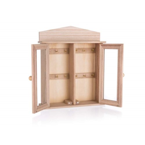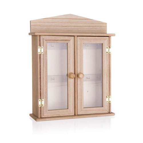 Skříňka dřevěná na klíče se skleněnými dvířky 27 x 22 x 6,5 cm je vhodná pro zavěšení klíčů, vyrobena z březového a smrkového dřeva.