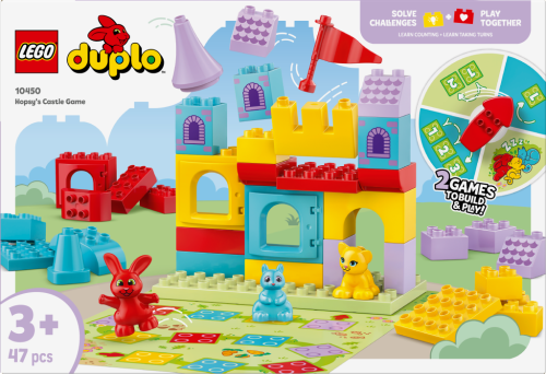 Užijte si zábavné rodinné aktivity se vzdělávací stavebnicí LEGO® DUPLO Hopsy a hra s hradem 2 v 1 Hra obsahuje spinner, hrací desku, 3 figurky zvířat a 47 kostek a dílků, ze kterých si můžete postavit řadu zábavných hradních hraček Zábavná desková hra pro celou rodinu Tato stavebnice obsahuje 2 hry, které dětem pomáhají učit se čísla a barvy a zároveň si děti procvičí střídání Tato vzdělávací hračka pomáhá batolatům učit se střídat se, spolupracovat v týmu a zároveň jim pomáhá rozvíjet jemnou motoriku a kreativitu