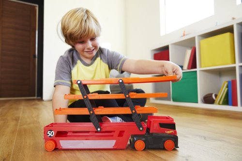 Hot Wheels® Mega Hauler je velká souprava pro velká dobrodružství. Na tenhle masivní náklaďák můžeš naložit až 50 aut v šesti rozšiřitelných úrovních - a to je jen začátek! V zadní části tahače je nájezdová rampa, která se dá připojit k setům Hot Wheels™ City. Můžeš taky otevřít kabinu a zaparkovat do ní další dvě auta nebo otevři rovnou celý průhledný boční panel. Děti si tak své miláčky mohou uložit na jejich speciální místa. Připoj Mega Hauler k oranžodráze Hot Wheels® a vyjeď s auty přímo na trať! Užij si spoustu zábavy a vyprávění napínavých příběhů!
