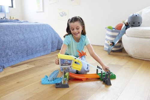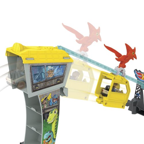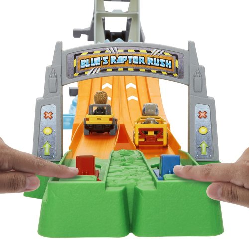 Závoďte, abyste unikli z ostrova Jurský svět v tomto setu dráhy Hot Wheels RacerVerse, který nabízí závodění a zipline v cíli. Set obsahuje závoďáky Blue Raptora a Owena s neoddělitelnými figurkami na sedadlech řidičů. Nejrychlejší auto se dostane na strážní věž a po zipline do bezpečí, zatímco jeho soupeř spadne do otevřené tlamy čekajícího Mosasaura. Set lze jednoduše složit na polovinu pro snadné skladování. Barva a provedení dekorací se mohou lišit.