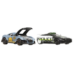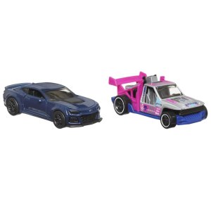 Sada obsahuje dva natahovací modely aut značky Hot Wheels v měřítku 1:43, které jsou vyrobeny především z kovu s doplňky z plastu. Každé autíčko má propracovaný design, který věrně napodobuje různé styly vozidel, od sportovních vozů přes terénní pickupy až po závodní speciály a klasické hot rod modely. Barvy jsou živé a kontrastní, od červené, modré, oranžové až po bílo-černé či stříbrné varianty, což přispívá k atraktivitě pro děti i sběratele.
