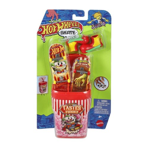 Vezměte si prkna na cesty s krabičkou Hot Wheels®, která pojme a ukryje 2 plně sestavené fingerboardy a pár skate a která připomíná balení žvýkaček! Otevřete "příchuť" jako "Bubble Blast" nebo "Snakeberry Sour", každá krabička je zdobená stylovou grafikou. Uvnitř jsou 2 exkluzivní prkna a pár odnímatelných skate bot s odpovídající kresbou a barvami. Každé balení se prodává samostatně dle aktuální nabídky.