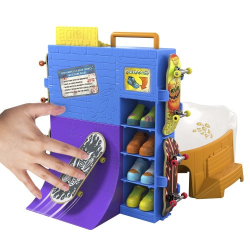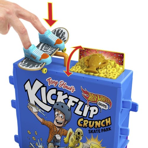 S herním setem Hot Wheels® Cereáliový fingerboard skatepark se můžete prohánět po velkolepé misce s cereáliemi. Tento skate set s motivem cereálií, vytvořený ve spolupráci s legendou skateboardingu Tony Hawkem, vyzývá fingerboardisty, aby projeli miskou s cereáliemi, předváděli vertikální triky na krabici s cereáliemi a nahoře zabrousili na zábradlí, aby mohli odhalit překvapivou trofej. Projeďte se po zadní rampě a zabruste na rail na lžíci, abyste měli větší šmrnc! Součástí je jeden exkluzivní fingerboard a odnímatelný pár skate bot s úložným prostorem pro čtyři prkna a čtyři páry bot. (Další prkna a boty se prodávají samostatně.) Barvy a provedení se mohou lišit.