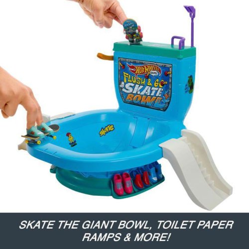Stisknutím páčky na toaletní míse Hot Wheels® Skate parku spláchněte fingerboard a začněte trénovat! Tento set má úžasné skate povrchy včetně obrovské mísy, rampy z toaletního papíru, nájezdové rampy a grindové dráhy, a navíc úložný prostor pro 4 fingerboardy a 6 párů bot. Součástí balení je jedno exkluzivní prkno a jeden pár odnímatelných skate bot.