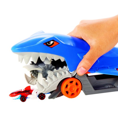 Hot Wheels® Žraločí tahač je navržen podle ikonického autíčka Hot Wheels® Shark Bite™. Tento parádní žraločí tahač popadne autíčko do svých čelistí a uloží ho do svého břicha díky speciálnímu požíracímu mechanismu, který se aktivuje, když se tahač rozjede. Potřebujete vyložit? V zadní části tahače je výstupní rampa, po které snědené angličáky snadno vyjedou ven. Hot Wheels® Žraločí tahač se dodává s jedním angličákem Hot Wheels®, ale může pojmout až čtyři další (prodávají se samostatně)! Děti od čtyř let se rády zakousnou do úklidu svých autíček díky tomuto tahači! Barvy a vzhled výrobku se mohou lišit.