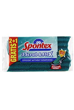 Spontex extra ohebná houbička na nádobí Scrub&Flex s abrazivní vrstvou bude skvělým pomocníkem při mytí nádobí. Účinně a snadno vyčistí každý záhyb bez poškrábání.